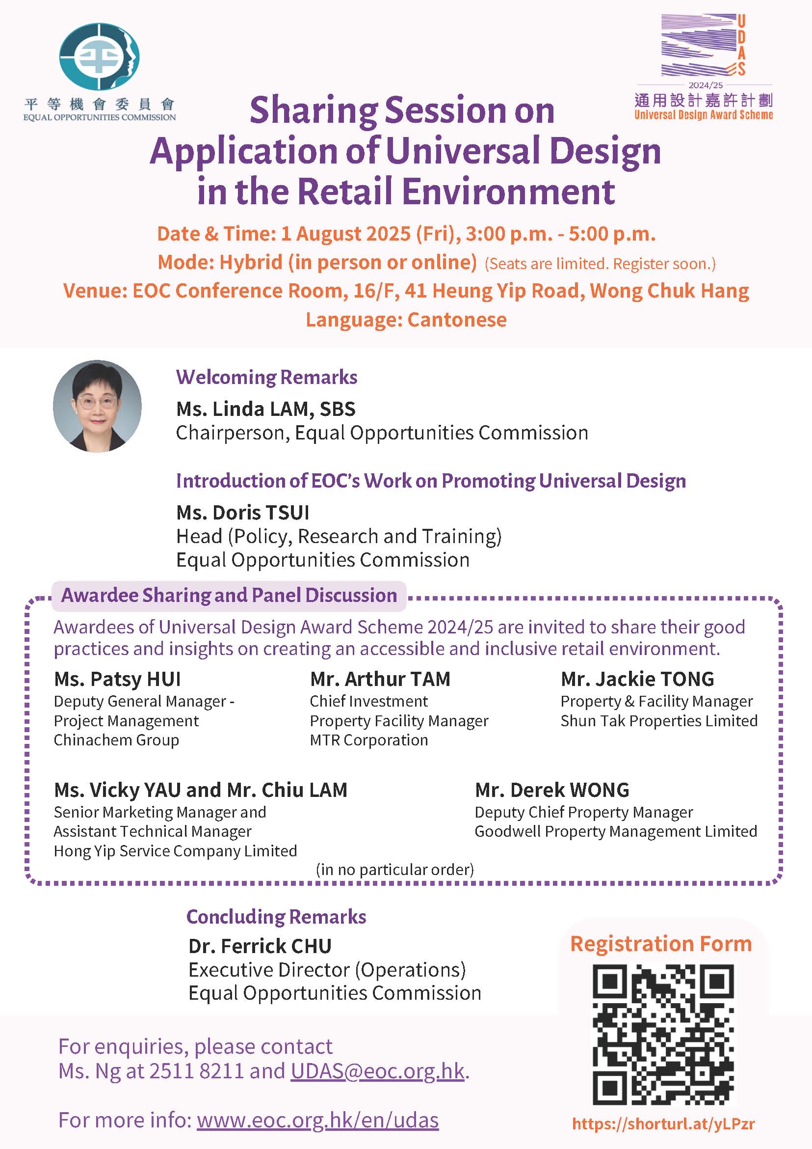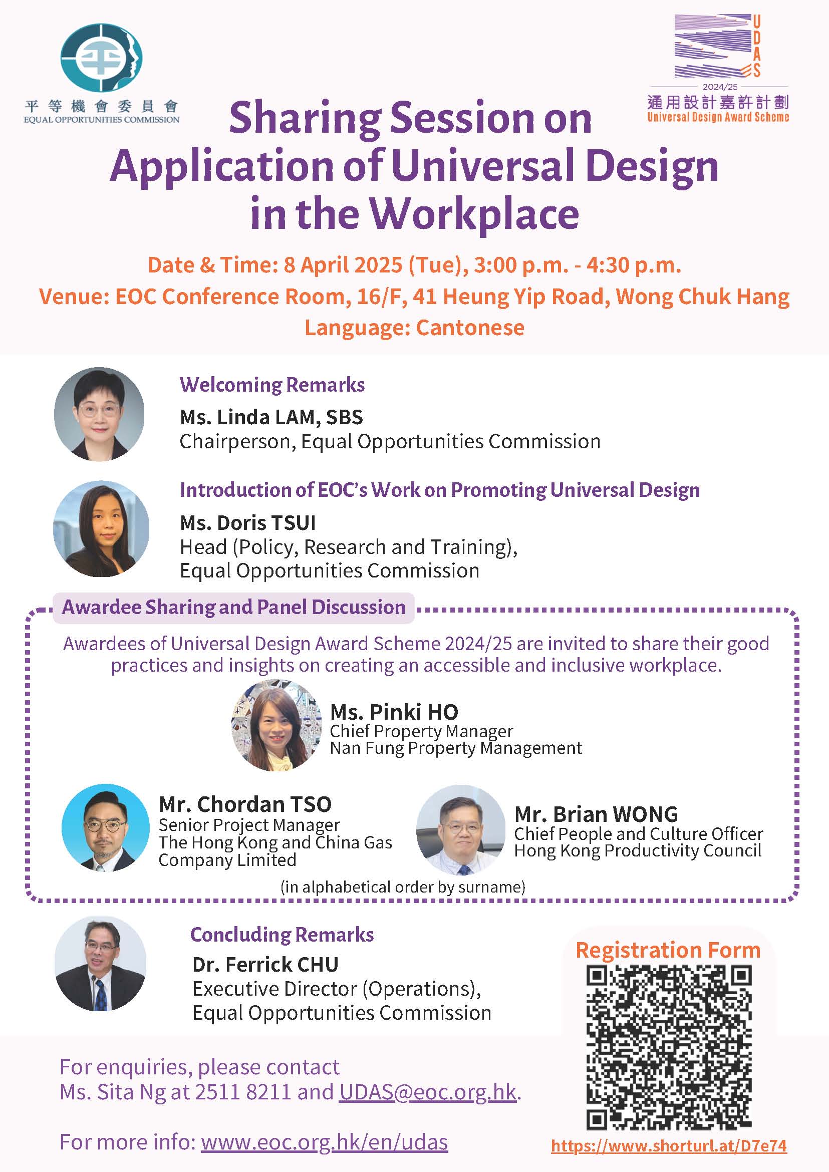 Select Year 2025 2023 2022 2021 2020 2019 2018 2017 2016 2015 2013 2012 2011 2009 2008 2007 2006 2002 2001 2000 2025 Sharing Session on "Application of Universal Design in the Retail Environment" 01 August 2025 Event Poster Introduction of EOC's Work in Promoting Universal Design (Chinese version only) - Ms Doris TSUI, Head (Policy, Research and Training), Equal Opportunities Commission Sharing Session on "Application of Universal Design in the Workplace" 08 April 2025 Event Poster Introduction of EOC’s Work in Promoting Universal Design (Chinese version only) – Ms Doris TSUI, Head (Policy, Research and Training), Equal Opportunities Commission Universal Design in the North Point Headquarters of The Hong Kong and China Gas Company Limited(Chinese version only) – Mr Chordan TSO, Senior Project Manager, The Hong Kong and China Gas Company Limited