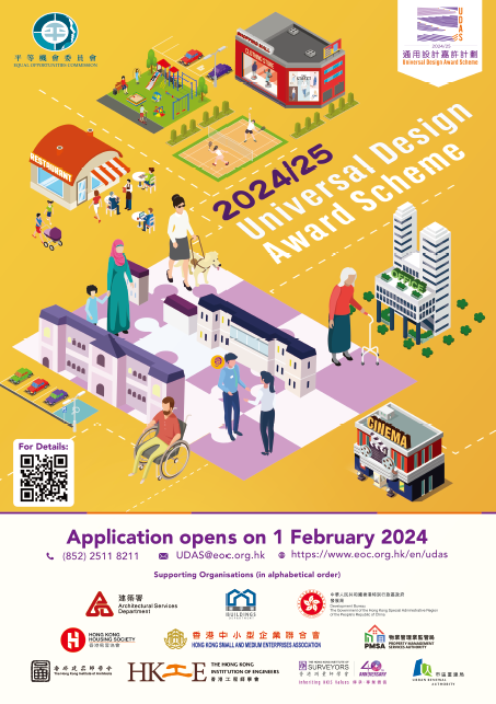 Interested parties may complete the form below to join the UA Pledge, describing how the current design of the facilities or services in your premises can support people with diverse needs. Completed form should be sent to the EOC by email (UDAS@eoc.org.hk). The EOC will assess and evaluate if the facilities or services provided by the company/ organisation align with Universal Design principles and are suitable for the UA Pledge. Companies/ organisations will be presented with an e-certificate as a recognition for their commitment after the pledge is validated by the EOC.