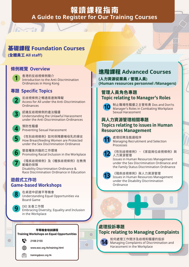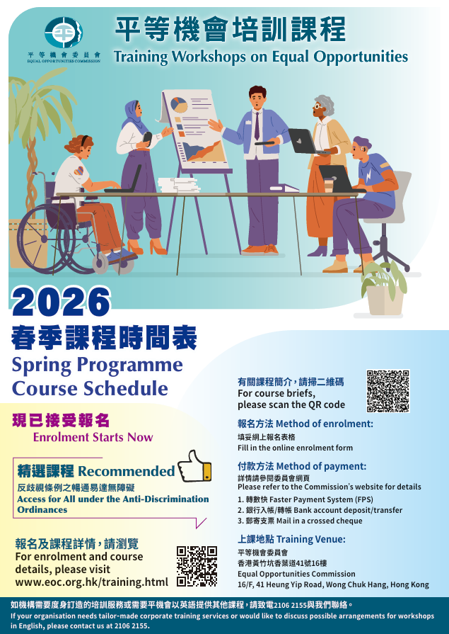 | 2026-05-08 | 14:30-16:00 | EOCO-6 | CHI | 香港的反歧视条例简介 (*网上教学) | 接受报名 |